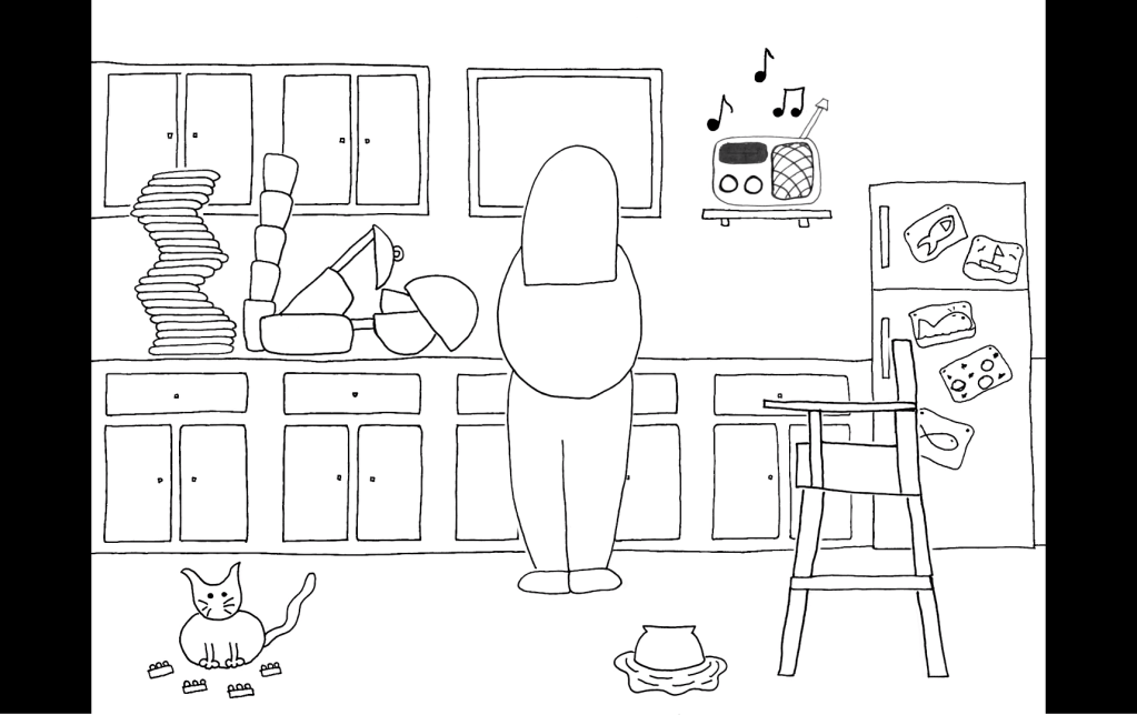 The music playing on a staticy radio inspires a woman in the midst of domestic duties to day dream.